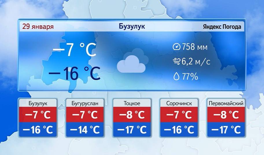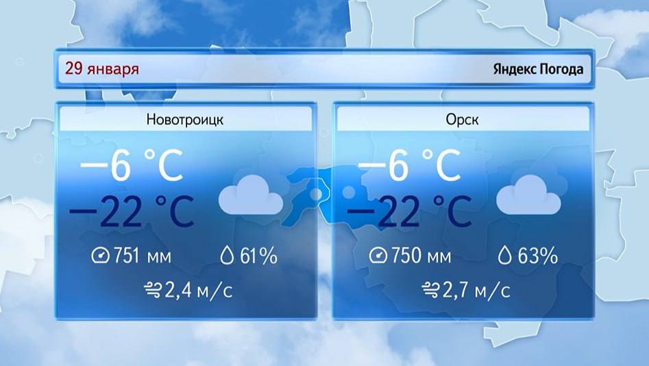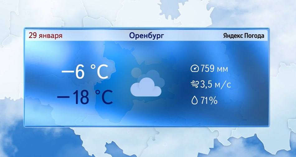 Доброе утро! Прогноз погоды на 29 января В Оренбурге сейчас -15°. Днём без существенных осадков. Ветер южной четверти 5-10 м/с. Температура воздуха -7° -9°. Атмосферное давление 759 мм рт.ст.Днем по области без существенных...