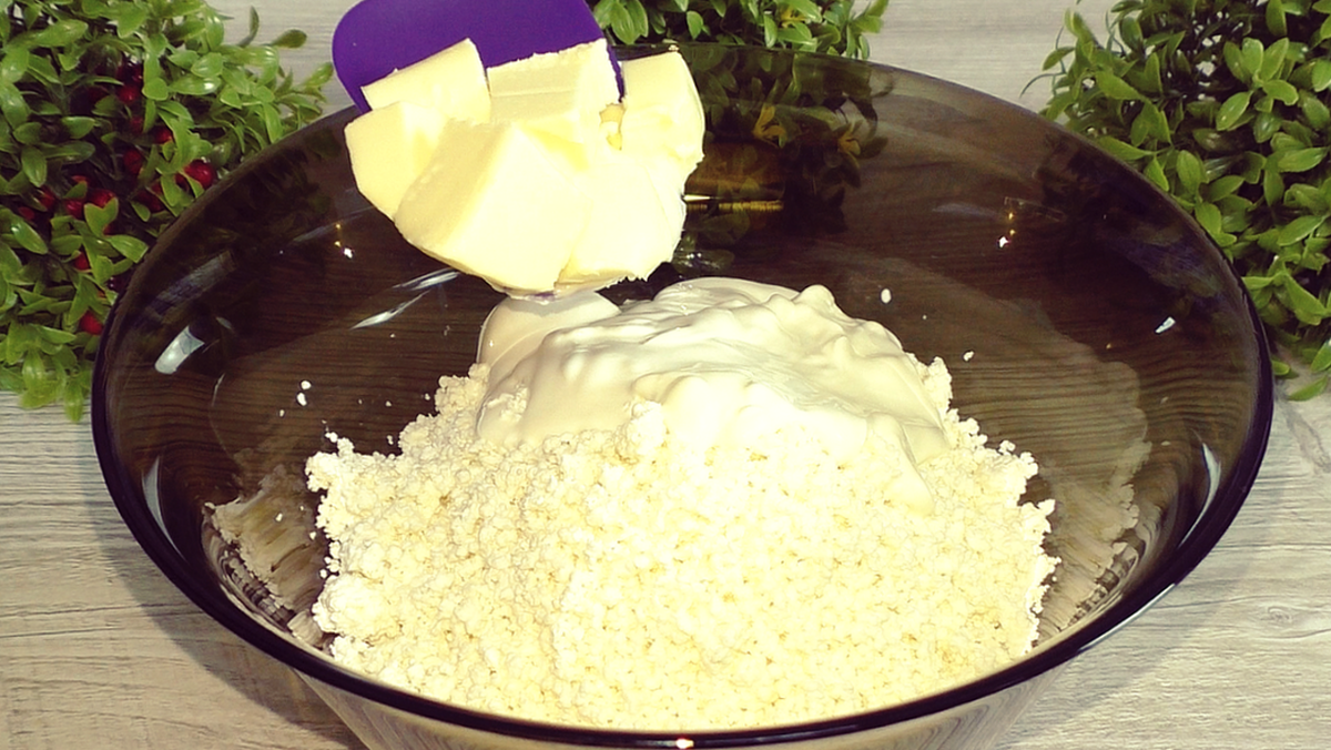 Для этой вкусной пасхи лучше всего использовать творог с жирностью 9%. В глубокой миске смешать творог с 20% сметаной и сливочным маслом, предварительно доведённым до комнатной температуры. Вместо сахара использовать варёную сгущёнку или обычный сахар, желательно в пудре, чтобы добиться лёгкой текстуры.