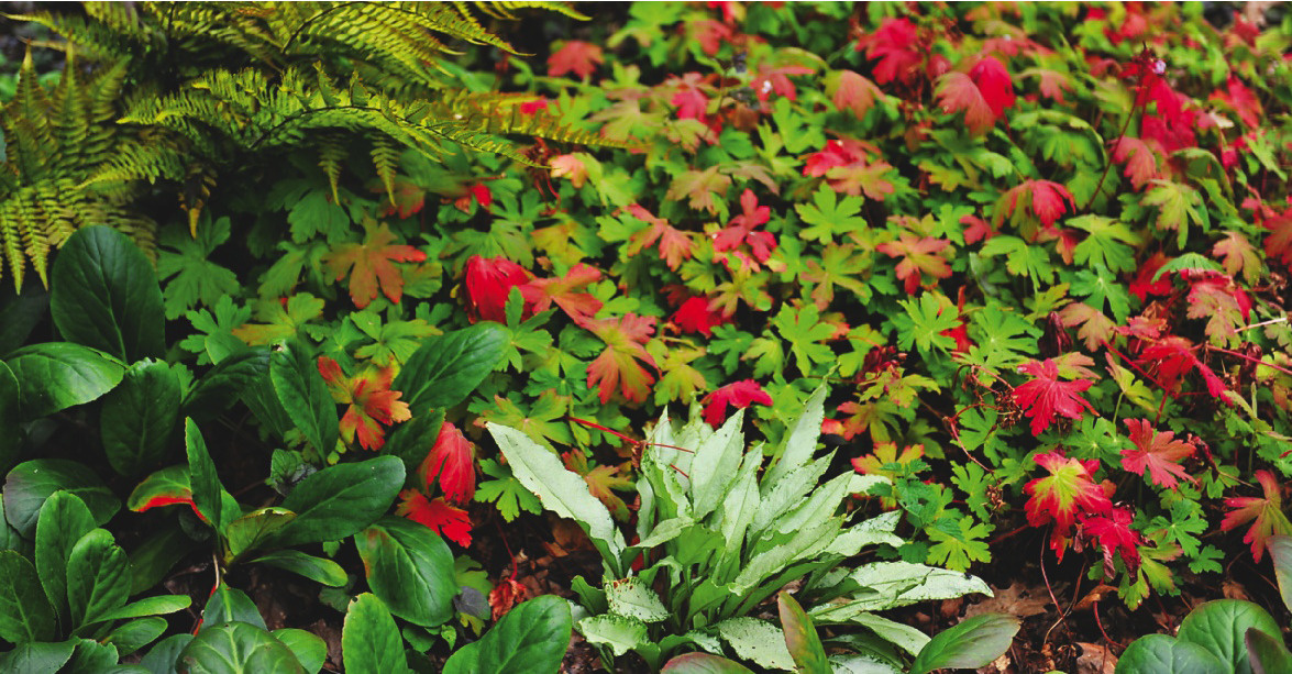 - Герань крупнокорневищная (Geranium macrorrhizum) — создает «ковер» из ароматной листвы и разнообразных цветов.