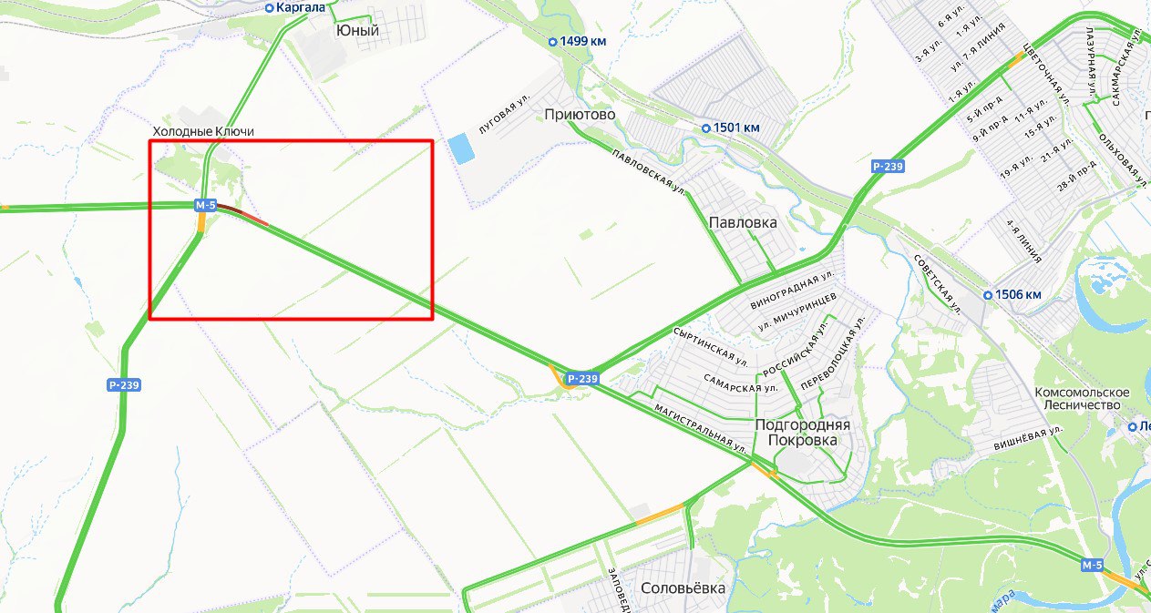 Судя по Яндекс-карте, перед перекрытым участком федеральной трассы Оренбург – Самара, с обеих его сторон есть скопления автомобилей. Однако они не сильно большие