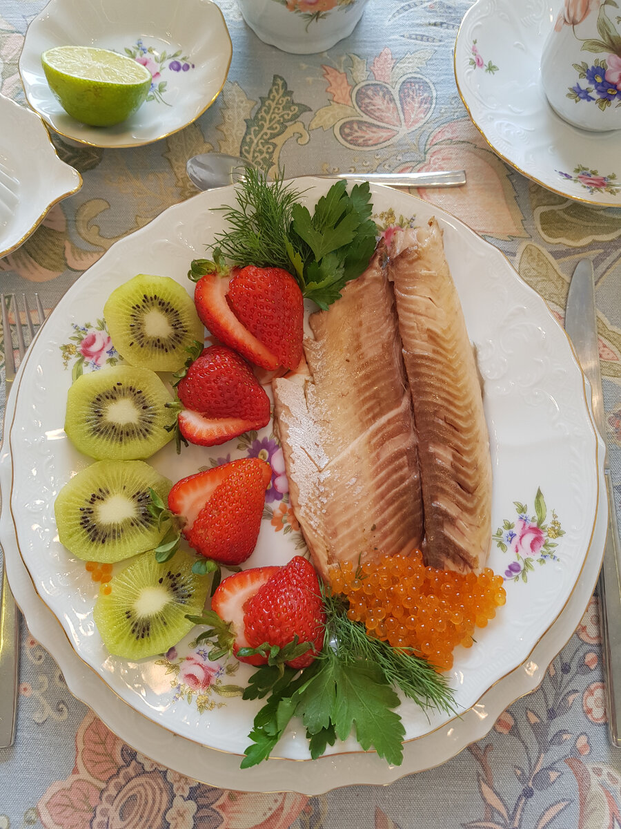 Готовую форель аккуратно достаньте из духовки, снимите кожу и отделите филе от костей с помощью кухонного инструмента. Выложите рыбу на тарелку, добавьте киви и клубнику, посыпьте зеленью укропа и петрушки. Не забудьте про половинку лайма и соковыжималку для создания идеального баланса вкуса, особенно если вы решили посолить икру.