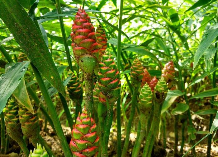 Имбирь впечатляет своим насыщенным ароматом и характерным острым вкусом благодаря высоким концентрациям эфирных масел. Его корневище плотное и толстое, с листовыми слоями, из которых вырастают длинные прямостоящие стебли, напоминающие камыш. Цветки имбиря могут быть оранжевого, желтого, коричневого или красного оттенков и образуют колосовидные соцветия, достигающие двух метров в высоту.