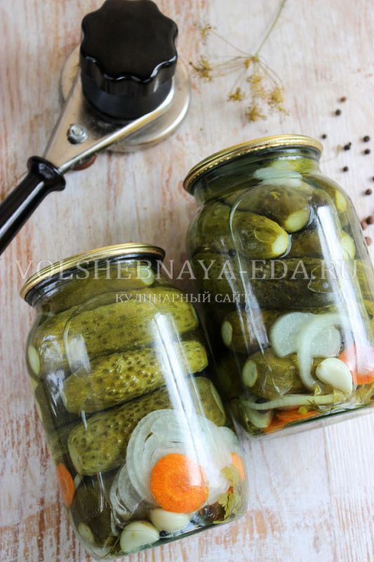 Закрываем банки стерилизованными крышками, но не закатываем. Ставим в кастрюлю с кипящей водой, подложив ткань, для защиты дна. Стерилизация займет 7-10 минут, пока огурцы не станут светло-оливковыми. После этого аккуратно вынимаем и закатываем. Переворачиваем банки вверх дном и укрываем до полного остывания. Для хранения больше подойдет темное и прохладное место, например, погреб. Такие огурцы могут храниться до одного года.