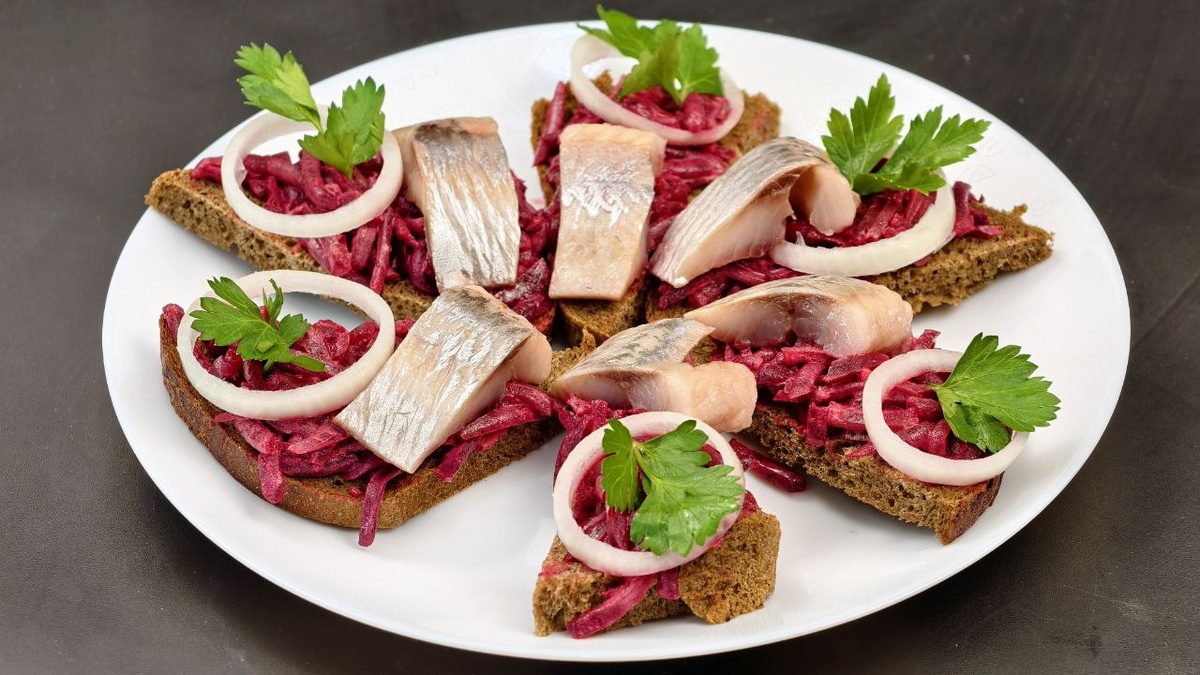 Для закуски лучше всего подойдет черный бородинский хлеб, нарезанный треугольниками. На каждый кусочек хлеба намазывают свекольную смесь, сверху кладут кольца репчатого лука и ломтик слабосоленой сельди. Хотя можно использовать и консервированную рыбу, свежая сельдь, подготовленная самостоятельно, придаст блюду более насыщенный вкус. Завершите оформление блюда, украсив его веточками петрушки или другой зеленью.
