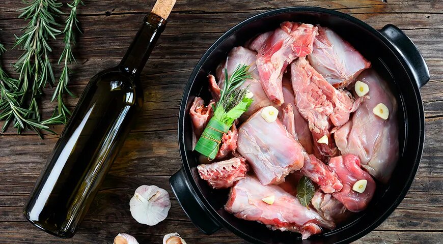 - Винный маринад: сухое вино, чеснок, тимьян, соль и перец; фрагменты кролика остаются сочными и ароматными после запекания.