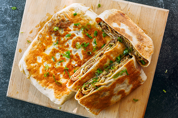 Мясные пироги пользуются особой популярностью на севере Китая, где мука значительно важнее риса. Каждая область предлагает свой уникальный подход к их приготовлению — от небольших закусочных вариантов, похожих на баоцзы, до обширных толстой лепешки с мясной начинкой. В этой интерпретации пирог имеет многослойную структуру, что позволяет ему сохранять легкость и сочность, с характерной хрустящей корочкой.