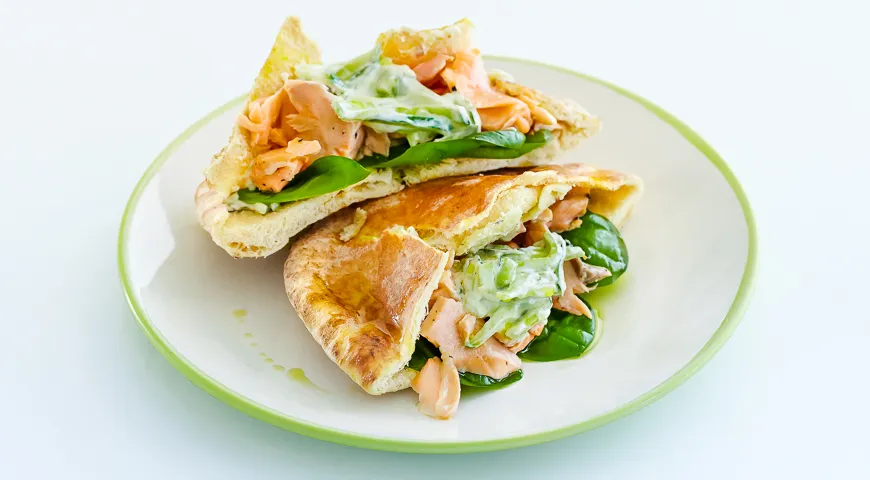 Шаг 4. Собираем сэндвич: На дне питы разместите лист салата, сверху добавьте немного соуса, затем огурцы, порей и ломтики семги. Завершите еще одним слоем соуса — ваш сэндвич готов!