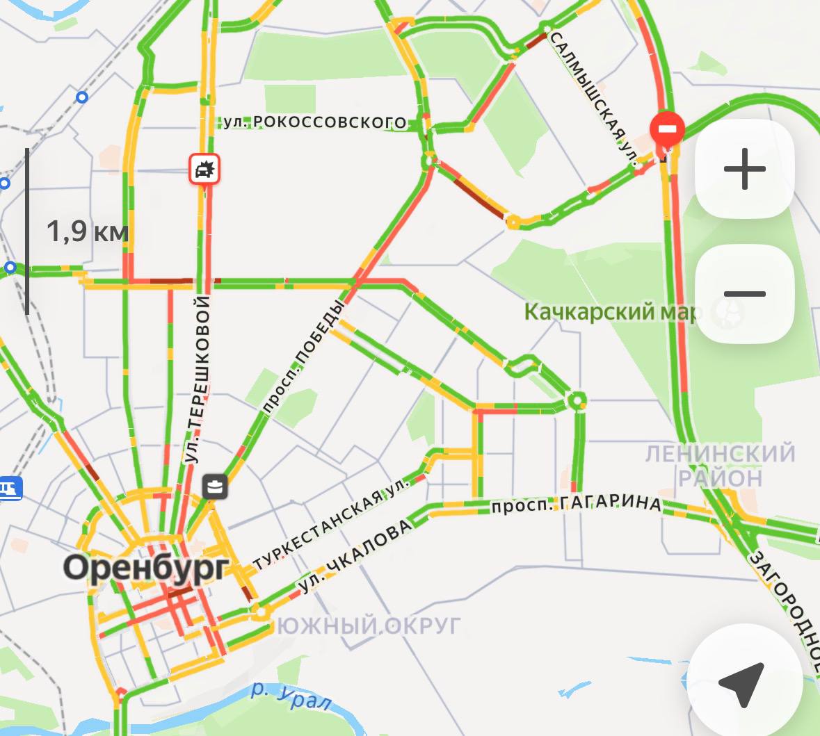 По традиции плотно стоят проспекты Победы и Терешковой, а также центральная часть Оренбурга.