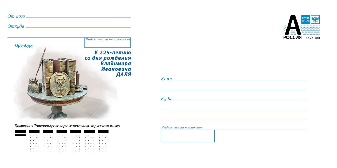 Художественный маркированный конверт Почты России, посвященный 225-летию Владимира Даля, выпущен АО «Марка» по инициативе Оренбургского благотворительного фонда «Евразия». Его тираж 50 тысяч экземпляров, а официальное гашение состоится в день рождения выдающегося лексикографа, этнографа и писателя – 22 ноября.