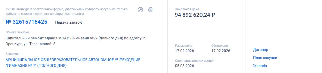 Начальная стоимость контракта — 94,9 млн рублей. Заявки принимаются до 5 марта.