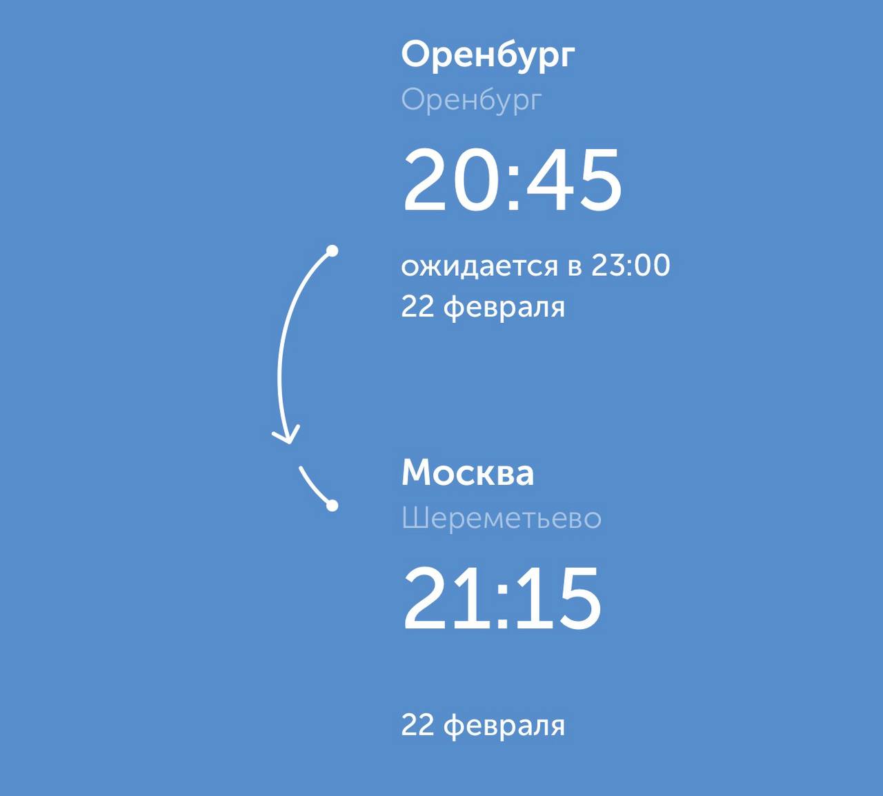 Рейс из Москвы вместо 15:35 вылетел в 18:03. Прилет в Оренбург изначально планировался на 19:45, теперь ожидается в 21:55.