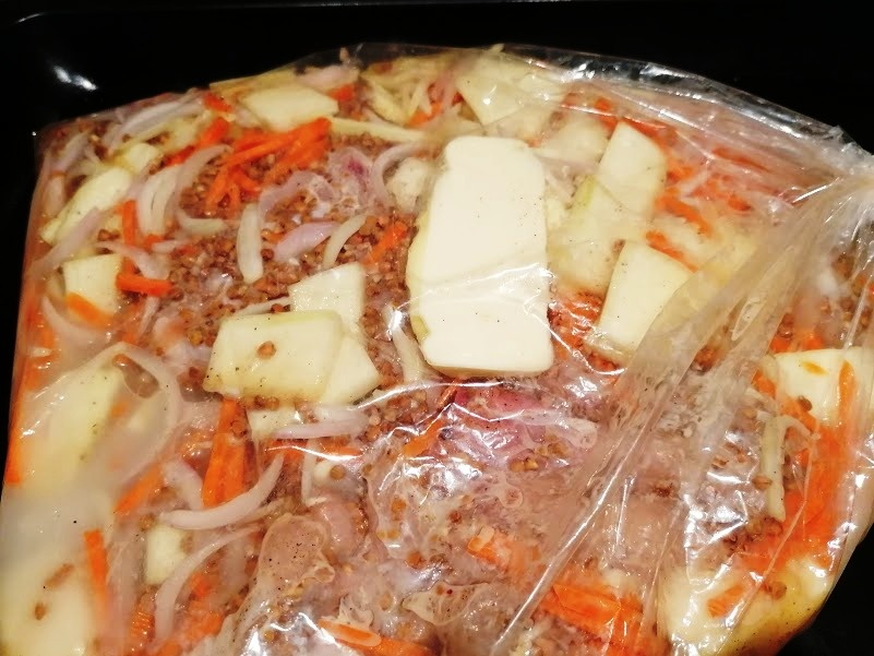 Выкладываем курицу с маринадом и овощи в рукав для запекания, добавляем 1,5 стакана воды и кусочек сливочного масла. Закрываем рукав и помещаем на противень. Запекаем 20 минут, затем аккуратно переворачиваем и готовим еще 20 минут. Чтобы подрумянить блюдо, разрезаем пакет и увеличиваем температуру до 200°C на 10 минут.