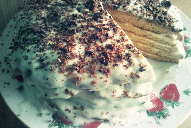 Для начала сметану нужно соединить с одним стаканом сахара и оставить на время, пока крем не станет необходим.Яйца взбиваются с другим стаканом сахара до пышной массы, после чего туда добавляются мед и сода. Затем эту смесь помещают на паровую баню, непрерывно помешивая, до увеличения ее объема в три раза.После достижения нужной консистенции массу следует слегка охладить, добавить три стакана муки и замесить плотное тесто.Разделите тесто на 12 частей, раскатайте каждый кусок на присыпанном мукой столе.Коржи выпекаются при температуре 200 градусов в течение нескольких минут, до появления золотистой корочки.Остуженные коржи складываются в торт, между ними требуется намазать кремом (достаточно пары столовых ложек) и дать пропитаться.Чудо на вашем столе