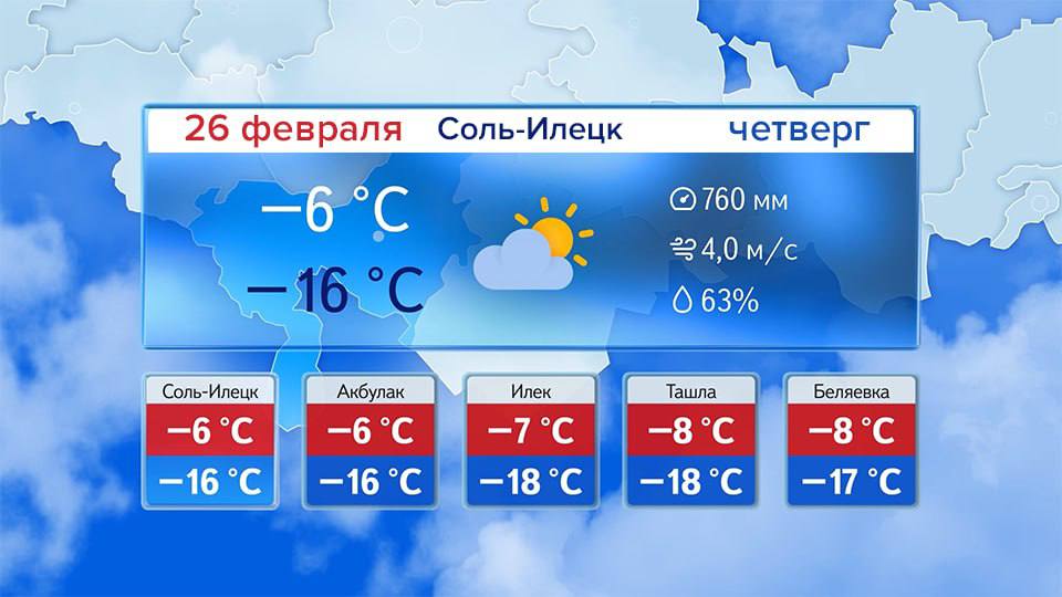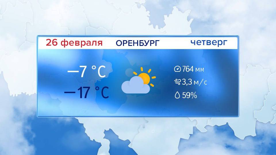 Доброе утро! Прогноз погоды на 26 февраля В Оренбурге сейчас -16°. Днём без осадков. Ветер восточной четверти 5-10 м/с. Температура воздуха -7° -9°. Атмосферное давление 764 мм рт.ст.Днем по области без...