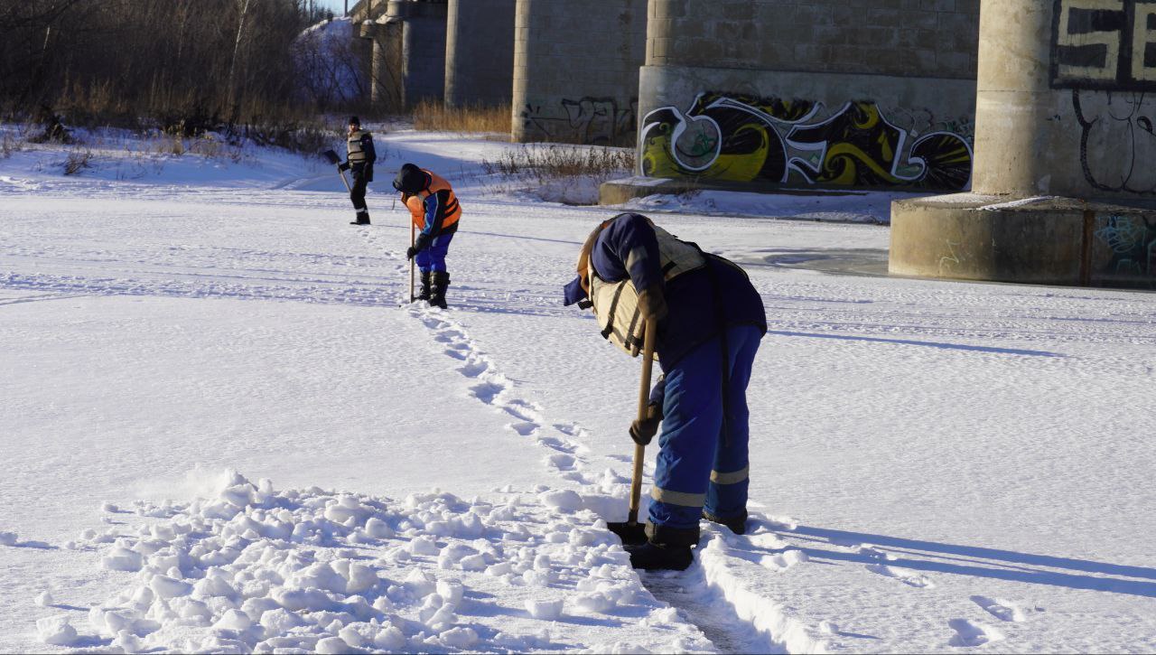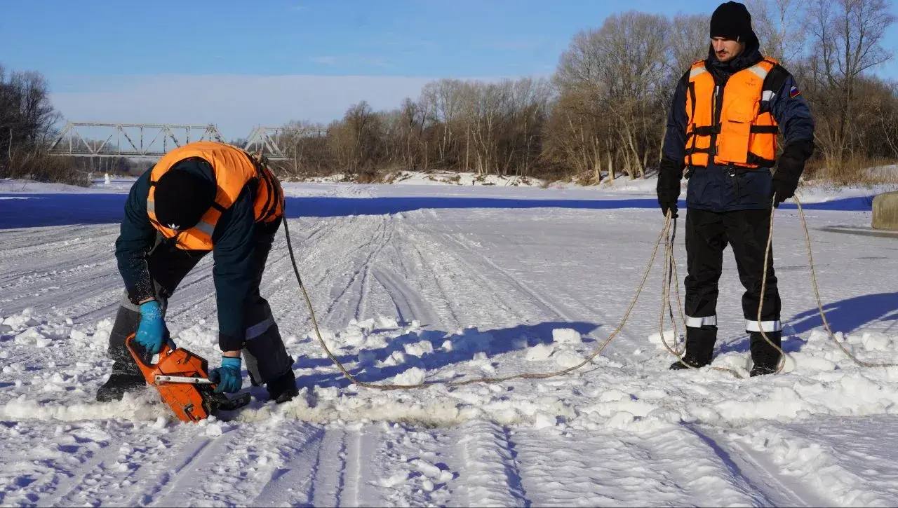 Работы ведутся в районе автомобильного моста: лед режут на квадраты примерно в десяти метрах от берега, сообщает администрация города.