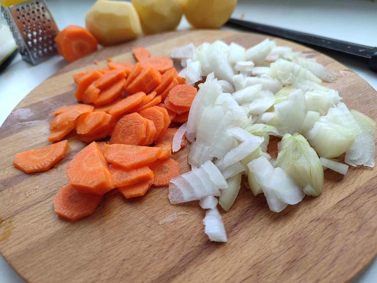 Первым делом нарезаем лук и морковь. В глубокой сковороде доводим воду до кипения и добавляем нарезанные овощи. Уменьшив огонь, даем им потушиться. После этого добавляем нарезанную картошку, заливая кипящей водой, чтобы она была покрыта.