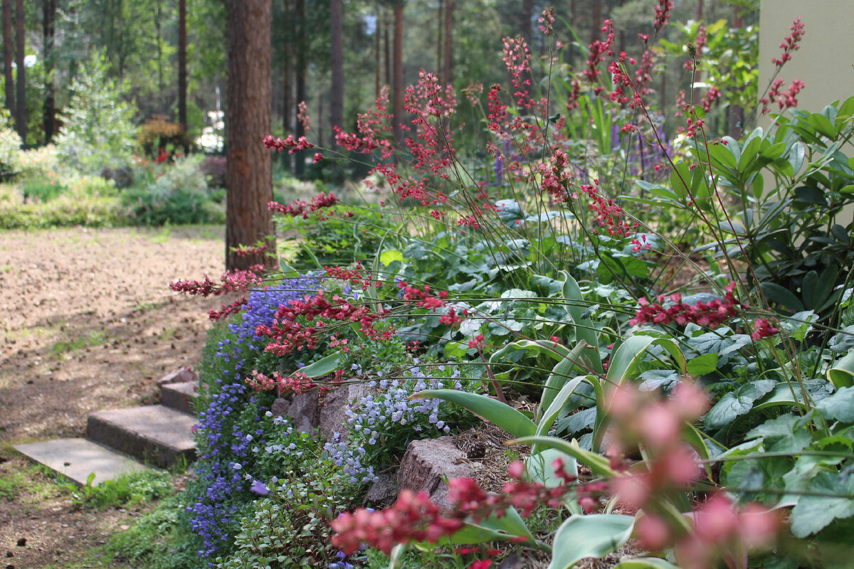 Некоторые участки требуют больше внимания, чем другие. Например, бордюр вдоль проезда предъявляет высокие требования к эстетике, поэтому растения меняются каждый сезон. Отказ от газона в пользу соснового опада также снизил трудозатраты на уход за территорией.