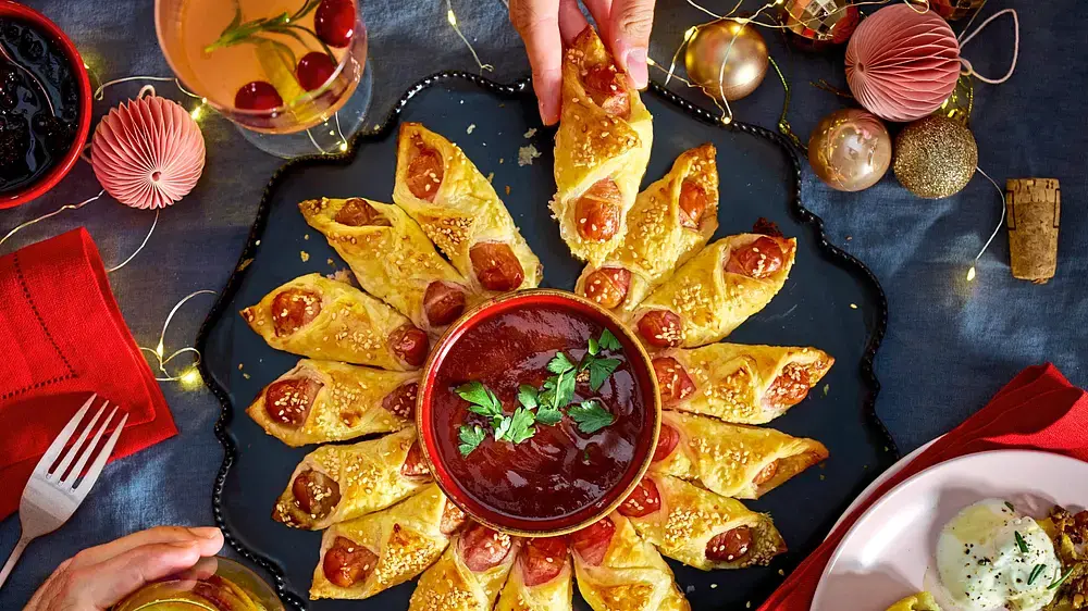Сначала разморозьте тесто и нарежьте его на прямоугольники (около 15-16 штук). Сосиски очистите от оболочки, разрежьте пополам и сделайте небольшой надрез на каждом конце. Оберните сосиски беконом и выложите их на подготовленное тесто. Скрепите края, формируя «одеялко». Смажьте заготовки взбитым яйцом и присыпьте кунжутом.