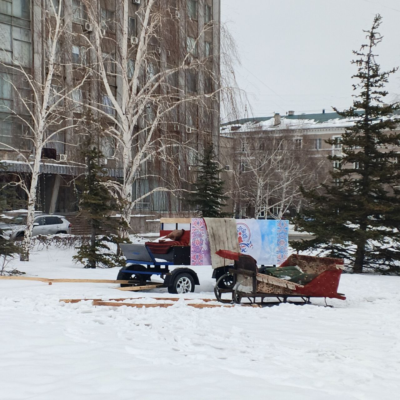 Газон перед зданием администрации Орска превратился в стоянку телеги и саней