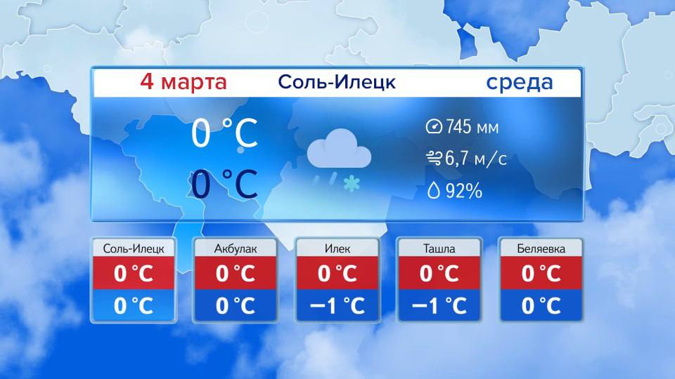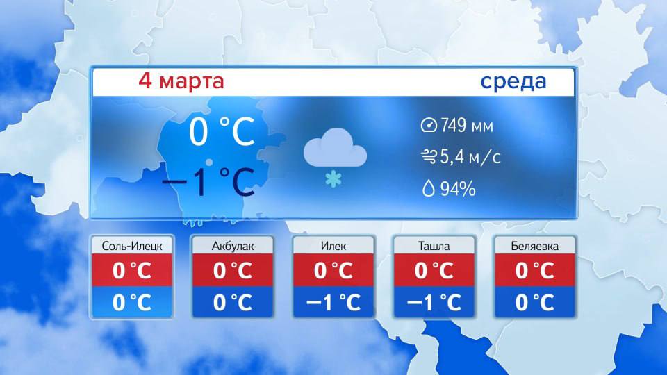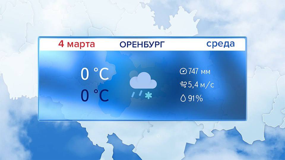 Доброе утро! Прогноз погоды на 4 марта В Оренбурге сейчас 0°. Днём небольшие осадки в виде мокрого снега. Ветер юго-западной четверти 8-13 м/с. Температура воздуха -1° +1°. Атмосферное давление 746 мм рт.ст.Днем по области в большинстве районов ...