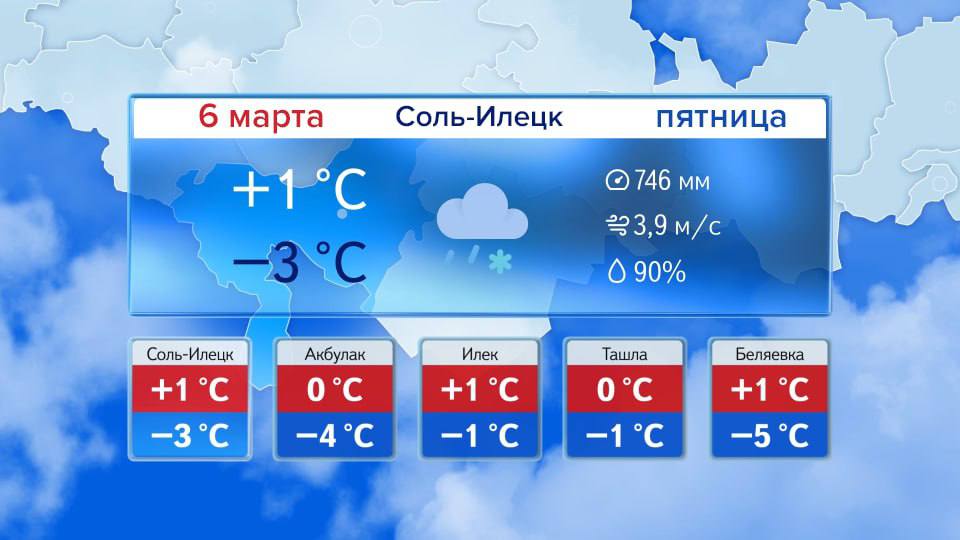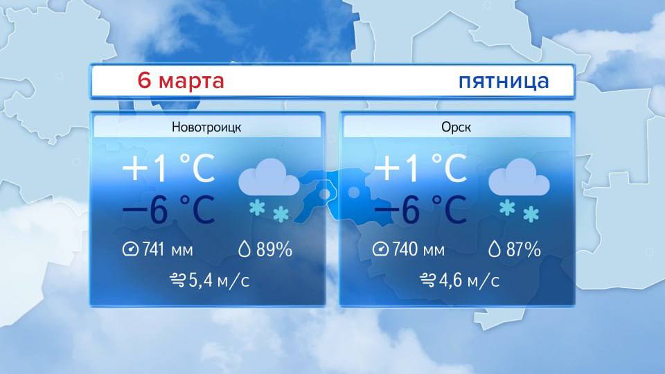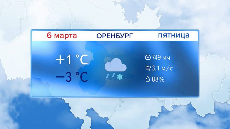 Доброе утро! Прогноз погоды на 6 марта В Оренбурге сейчас 0°. Днём осадки преимущественно в виде снега. Ветер юго-западной, западной четверти 9-14 м/с. Температура воздуха -1° +1°. Атмосферное давление 748 мм рт.ст.Днем по области...