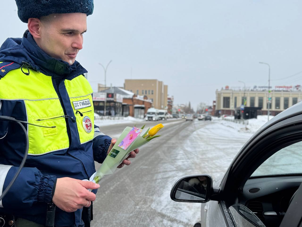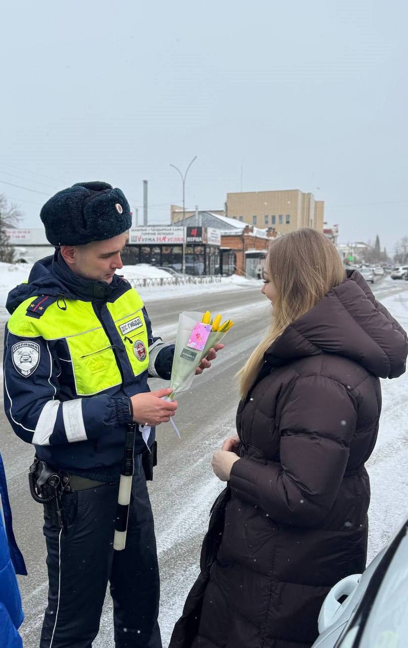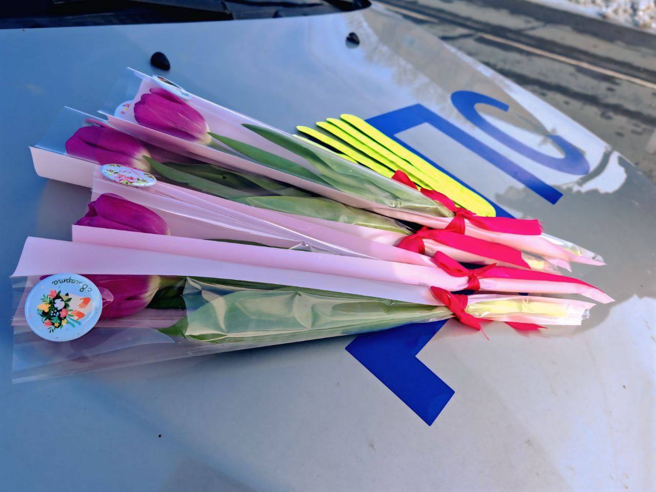 В преддверии праздника сотрудники Госавтоинспекции присоединились к Всероссийской акции «Цветы для автоледи». Вместо привычной проверки документов женщины за рулём получали букеты и комплименты. Цветы дарили не только водителям, но и юным пассажиркам.