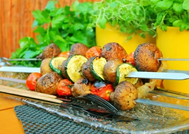 Готовые шампиньоны подавайте горячими. Это легкое и питательное блюдо станет отличным сопровождением к мясным шашлыкам или овощам на гриле. Приятного аппетита!