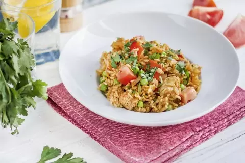 Переходя к индейке, лук нарезать мелкими кубиками, а помидор — крупными. Чеснок следует измельчить. Нагрейте сковороду с ложкой растительного масла и обжарьте индейку на сильном огне в течение 5-7 минут, не забывая периодически помешивать. Затем добавьте к индейке лук, чеснок, готовый рис, горошек и нарезанные помидоры — замораживать горошек не нужно. Специи, такие как кардамон, корица и паста карри, вводятся по вкусу; помните, что паста карри может быть острой. Посолите, перемешайте, добавьте пару столовых ложек воды, накройте сковороду крышкой и тушите на сильном огне еще 2-3 минуты.