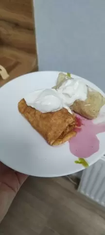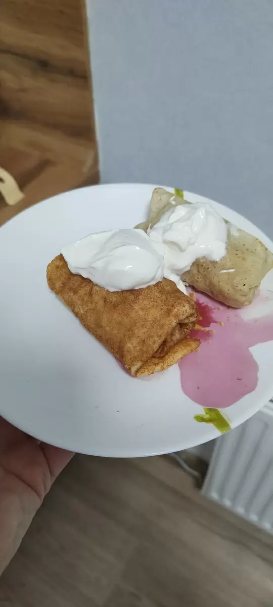 Утро начинается с горячих блинов с фаршем, которые легко можно найти в морозильнике. Если использовать менее калорийный фарш, завтрак располагает к легкости. Сметана придаст блюду особый вкус и нежность.