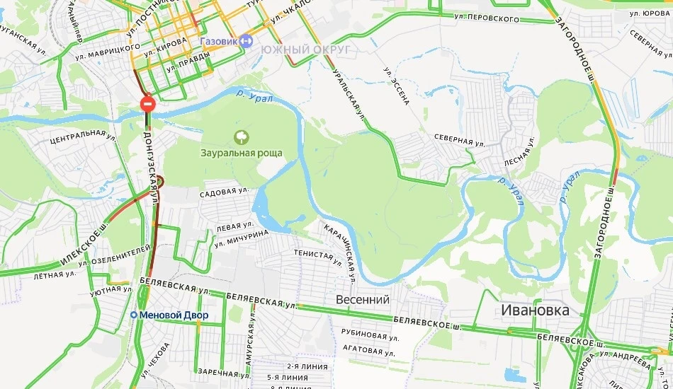 На выезде с Илекского шоссе движение затруднено, поток автомобилей большой, но движется. Сервис Яндекса обозначает сегодня его красным цветом.