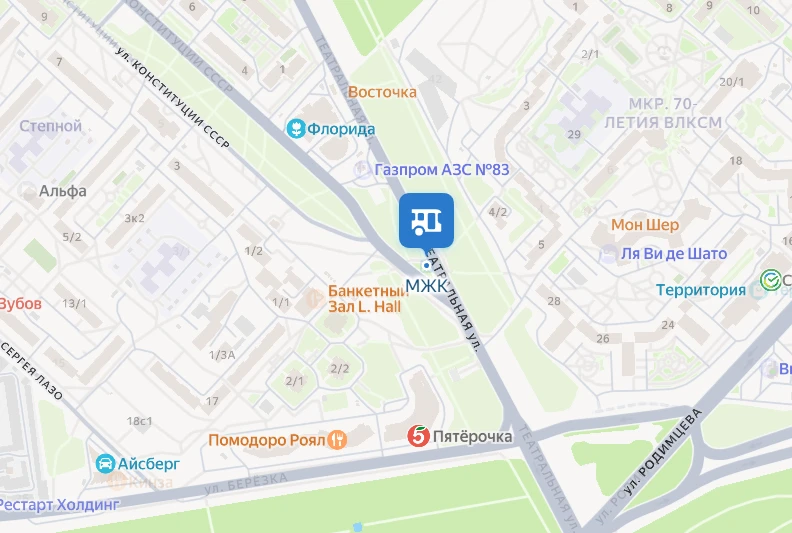 остановки МЖК (на пересечении улиц Театральной и Конституции СССР). По словам людей, пешеходы, в том числе школьники и мамы с колясками, ежедневно переходят эту улицу. Проблема в том, что движение на участке очень оживленное, а пешеходный переход — нерегулируемый и двойной.