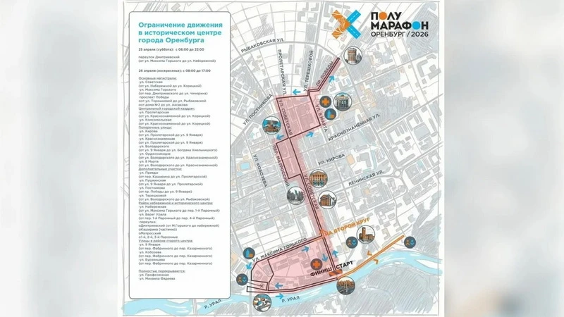 Улицы Советская, Горького, пр. Победы, набережная Урала — всё это будет беговой трассой. В связи с этим 25 и 26 апреля будет перекрыт центр Оренбурга.