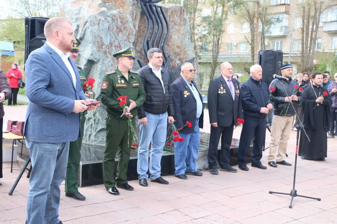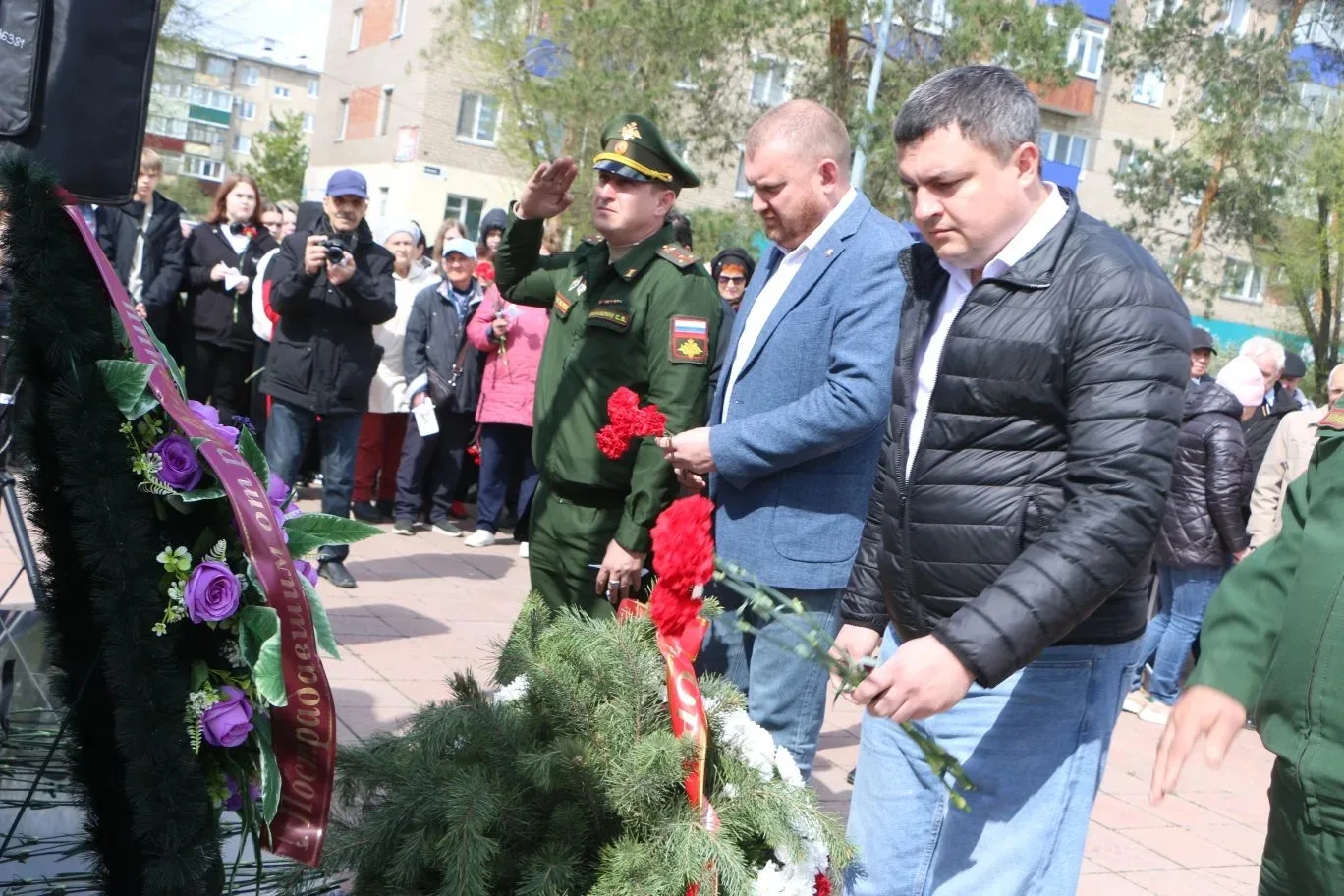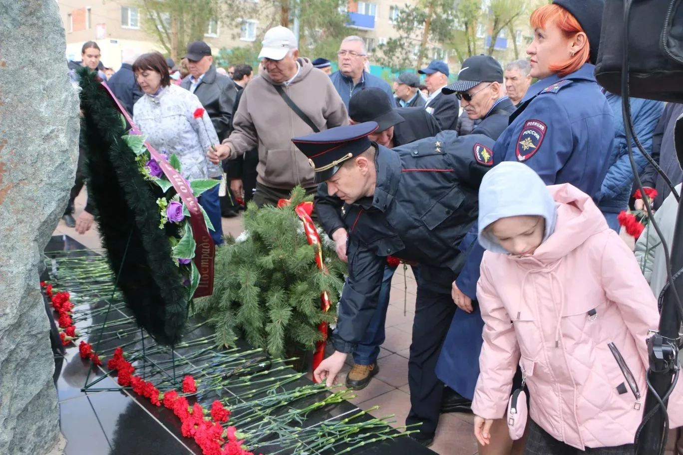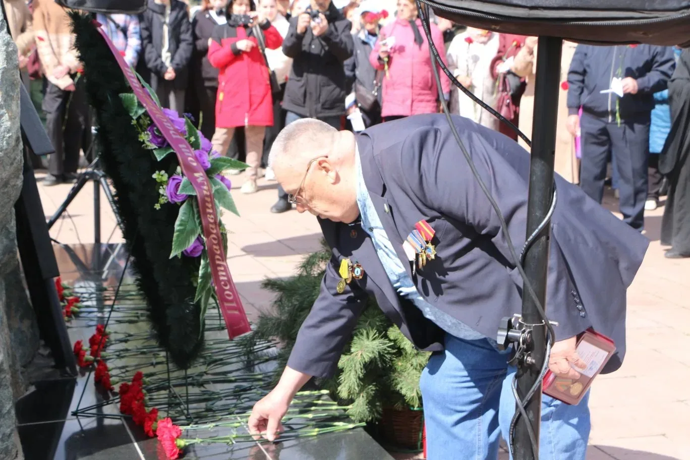 Участники церемонии почтили память погибших минутой молчания и возложили цветы к памятному знаку.