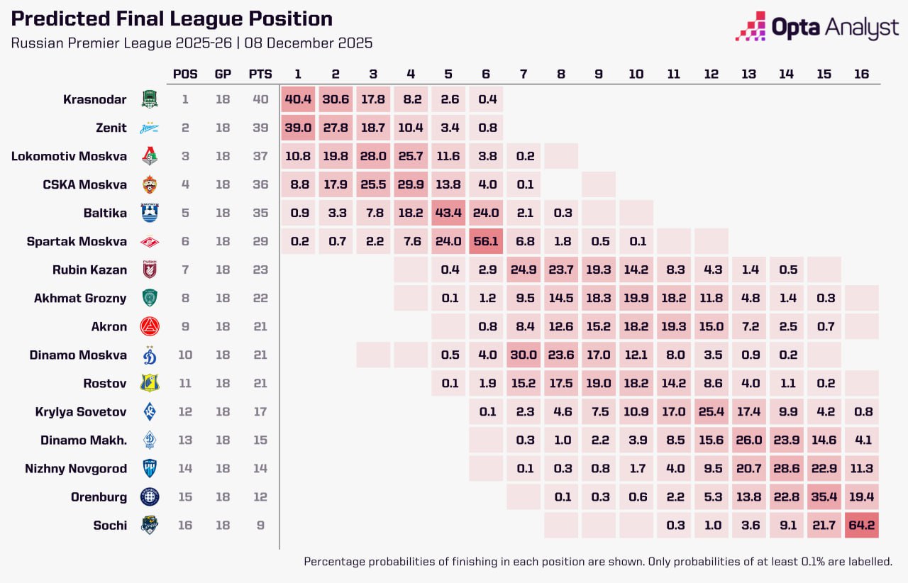 Шансы «Краснодара» защитить титул оцениваются в 40,4%, вероятность чемпионства «Зенита» — в 39%, «Локомотива» — в 10,8%, ЦСКА — в 8,8%, «Балтики» и «Спартака» — менее чем в 1%.